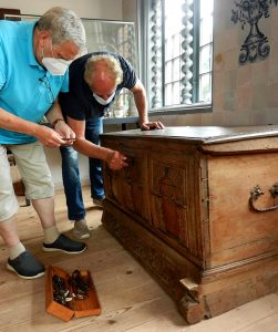 uns im Museum. Er hat den Restaurierungsbedarf unserer Eiderstedter DREISTERNTRUHE untersucht. Nicht gut, dass zunächst der Schlüssel nicht auffindbar war. Zum Glück kam mal wieder unser Vorstandsmitglied Walter Petersen zu Hilfe und hat den Schlüssel aus dem „Versteck“ hinter der Alkoventür hervorgezaubert. Jetzt warten wir gespannt auf das Urteil von Herrn Jansen und vor allem darauf, dass wir dann auch großzügige Unterstützung für die anstehenden Restaurierungskosten bekommen.
