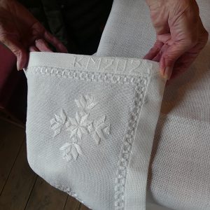 große Erfahrung mit textiler Handarbeit. Vor ein paar Jahren hat sie eine Tischdecke mit Hardanger Stickerei speziell für den Tisch im Hochzeitzimmer des Museums angefertigt und uns geschenkt. Gestern nun war sie mit einer zweiten Hardanger Decke bei uns, die wir gemeinsam aufgelegt haben. Und heute konnten gleich zwei Brautpaar sie bei uns einweihen.