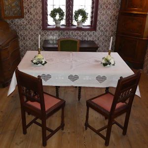 Diese Tischdecke ist natürlich wieder eine Spezialanfertigung und das Muster mit Herzen von Frau Merta selbst entworfen. Insgesamt stecken ungefähr 300 Arbeitsstunden in diesem wunderschönen Unikat. Wir bedanken uns ganz herzlich und hoffen, dass die Kreativität, Geduld und Freude, die in diese Decke geflossen ist, auf alle hier geschlossenen Ehen abfärbt 😊