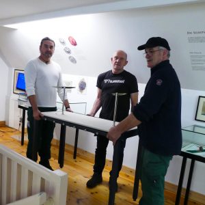 geschlossen, weil wir umbauen. Ein Anlass dafür ist die besondere historische Tür aus Eiderstedt, die wir demnächst als neues Exponat bekommen. Um für die Tür Platz in der Ausstellung zu schaffen, müssen wir im ganzen Haus Vitrinen umstellen und umgestalten. Gestern haben die ehrenamtlichen Vorstandsmitglieder im Haus ordentlich geschuftet – u.a. mussten alte sehr festsitzende Klebefolien entfernt werden. Heute hatten wir dann Hilfe vom Bauhof. Eugen, Swenn und Hermann waren großartige Träger und Problemlöser. Und so können wir auch getrost am Donnerstag wieder für Museumsgäste aufmachen auch wenn Kleinigkeiten, wie neue Objektbeschriftungen noch nachgerüstet werden müssen.
