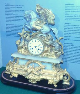einem das imposante Objekt in der Uhren-Vitrine kaum entgehen: Die „Pendule“ von 1872. Unser Besucher hat diese Uhr als sein Lieblingsobjekt im Museum auserkoren, weil es „so eindrucksvoll und detailreich ausgearbeitet ist“.