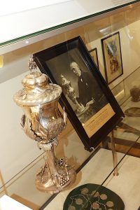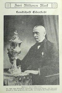 Für uns ist der Notgeldschein zum einen interessant, weil er ein Schlaglicht auf eine Krise wirft, deren Auswirkungen auf den damaligen Alltag für uns heute nur schwer vorstellbar ist. Zum anderen ist interessant, dass versucht wurde, diesen bald wertlosen Scheinen gestalterisch Wertigkeit zu geben. Es wurde sowohl Vorderseite als auch Rückseite bedruckt und hier ein Motiv gewählt, dass bei uns im Original zu sehen ist: Der berühmte Eiderstedter Silberpokal und das Foto des letzten Ordonnazreiters, dem dieser gewidmet war.