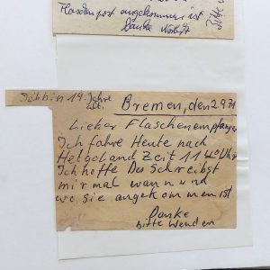 Flaschenpostbriefen. Die Flaschenposten sind über viele Jahre von einer Familie aus St. Peter-Ording hier am Strand gefunden worden. Zeitweilig war die Sammlung sogar als umfangreichste Flaschenpostsammlung im Guinnessbuch der Rekorde. Sehr spannend! Deshalb möchten wir im nächsten Jahr eine Sonderausstellung zum Thema machen und damit die weitgereisten und teilweise sehr amüsanten Texte zugänglich machen. Heute hat Frau Herzberg uns das Album schon mal ins Museum gebracht. Nun suchen wir aber noch weitere Flaschenposten, bei denen auch die Flasche erhalten ist. Wenn Sie eine solche besitzen und sie als Leihgabe für die Ausstellung im nächsten zur Verfügung stellen können, melden Sie sich bitte im Museum. Vielen Dank!