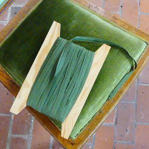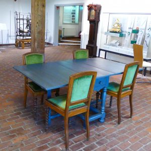 Stühle an einem Tisch, die zwar historisch, aber nicht Teil der Museumssammlung sind. Deswegen ist es erlaubt auf ihnen zu sitzen. Wenn z.B. eine Trauung stattfindet, werden Tisch und Stühle anschließend gerne für einen kleinen Sektumtrunk genutzt. Nutzung ist auch immer Abnutzung und so sind nun einige der Samtlitzen um die Polsterung abgegangen.