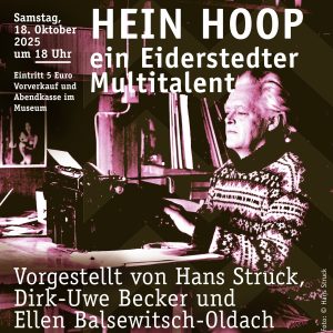 Samstag 18.10. 18:00 Uhr: Erleben Sie einen lebendigen Blick auf das Schaffen (1927–1986): Holzbildhauer, Grafiker, Schriftsteller und Satiriker. Seine humorvollen und scharfsinnigen Texte auf Hoch- und Plattdeutsch haben die kulturelle Landschaft Eiderstedts geprägt und inspirieren bis heute. Die drei Referenten, alle auf Ihre Weise Kenner von Hein Hoop, führen durch sein Werk und Leben, erzählen Anekdoten und geben Einblicke in Hoops vielschichtiges Schaffen.Wir freuen uns auf Ihr Kommen!