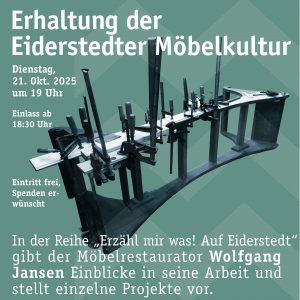 Am Dienstag, 21. Oktober um 19:00, findet bei uns die allerletzte Veranstaltung der wunderbaren Reihe „Erzähl mir was! Auf Eiderstedt“ statt. Der Möbelrestaurator Wolfgang Jansen erzählt von seiner Arbeit mit den historischen Möbeln, die er für das Museum restauriert hat. Im Fokus steht dabei das letzte Projekt: die sehr aufwendige Arbeit mit unserem Biedermeiersofa. Das Schöne: man kann das Ergebnis gleich bei uns bewundern. Und mindestens genauso schön ist Wolfgang Jansens erfrischende Art aus dem Nähkästchen zu plaudern. Herzlich willkommen! - 17. Oktober 2025