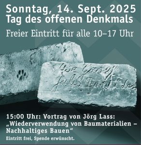 uns: 122 Besucher kamen ins Museum und davon 20 um 15:00 zu dem interessanten Vortrag über Nachhaltigkeit und Wiederverwendung von Baumaterialien! Jörg Lass ist ein Kenner von historischen Baumaterialien und ihren Herstellungsprozessen. Er konnte uns aber auch die neuesten wissenschaftlichen Erkenntnisse zu verschiedenen CO2 Bilanzen im Bausektor nahebringen sowie klassische und kreative Wieder- und Weiterverwendungsmöglichkeiten von Baumaterial erläutern. Dazu hatte er tolles Anschauungsmaterial dabei. Vielen Dank! - 12. September 2025